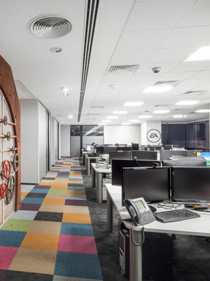The intelligent lighting system in the EA offices is based on daylight harvesting and hundreds of presence sensors.